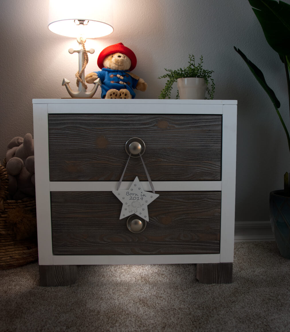 Under-mount lights come standard on all of our 2 drawer nightstands to illuminate your nursery with a gentle, ambient glow! A touch sensor on each side of the nightstand allows you to easily dim lights for sleeping or brighten them as needed. These LEDs offer three levels of soft light. Our nightstands also come standard with a built in USB port/outlet on its backside for charging phones, warming bottles, or plugging in a lamp or other devices.