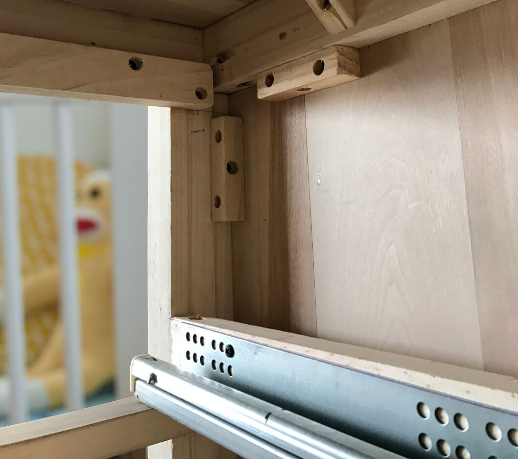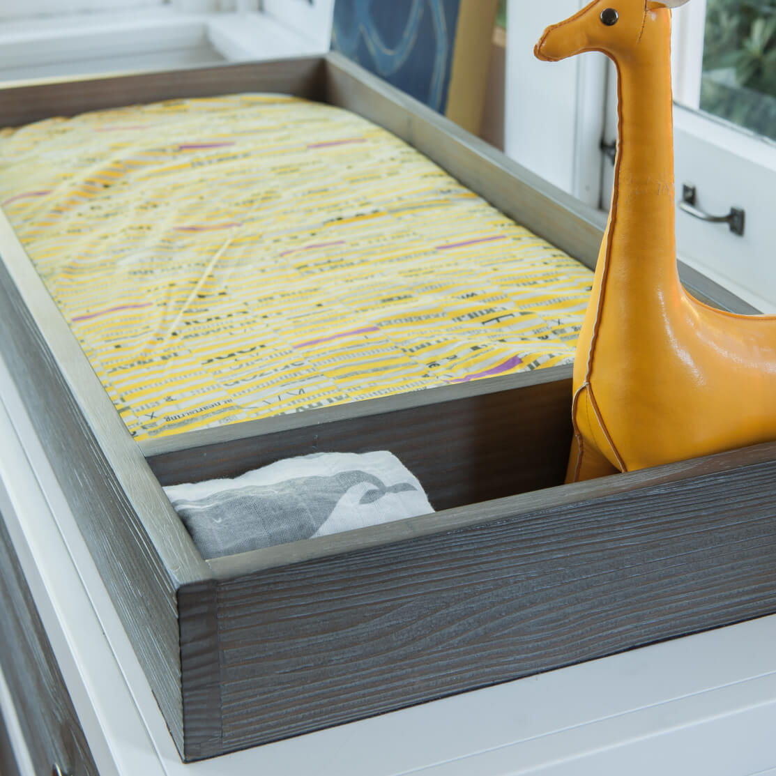 We use self-closing, under-mount, metal drawer glides with soft close mechanisms, used to prevent drawers from slamming on small fingers or waking baby during nap time. The sturdy glides Milk Street Baby uses have been tested multiple times. They are what we believe to be the best on the market. Easy to adjust, and able to withstand the wear and tear.