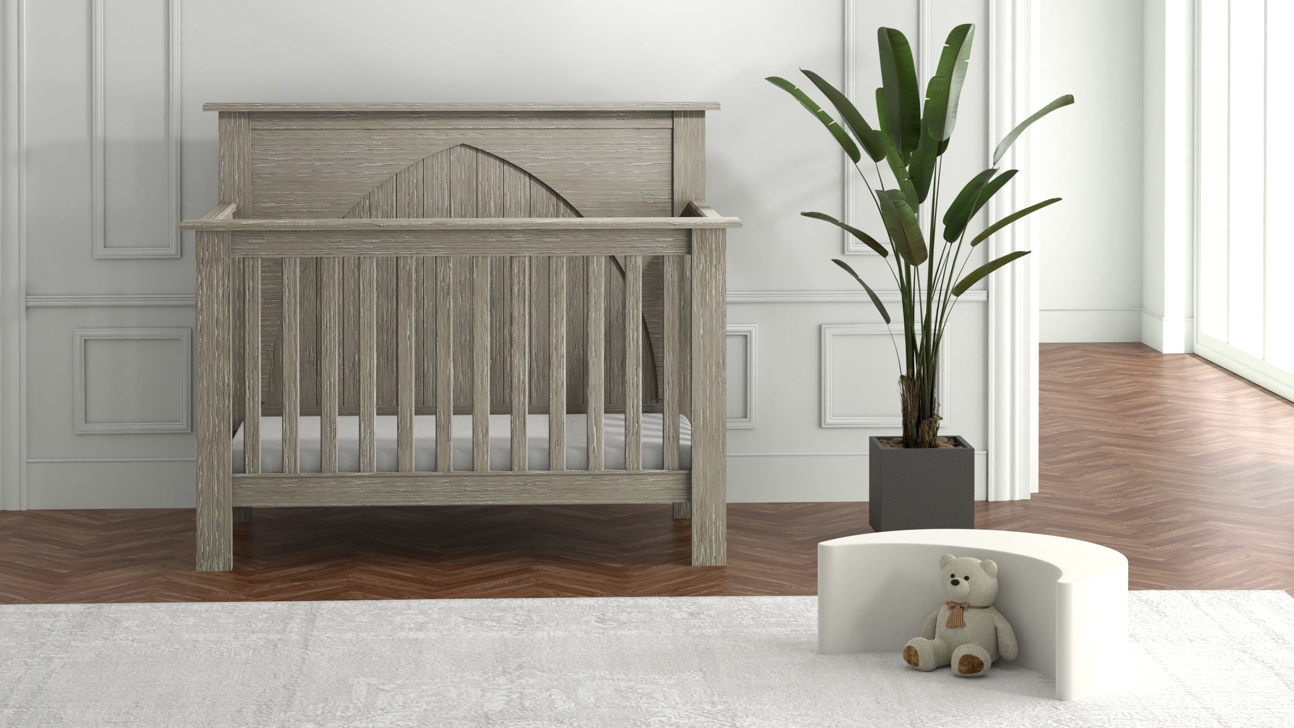 The inset head-board against our gorgeous arch creates a modern renaissance feel that you can design your nursery around. With the look and feel of reclaimed timber, its thick posts and classic profiles take us back in time. Gender neutral, this crib will works amid a modern mix, or in a rustic mountain house. The Winchester crib boasts that hand-finished appeal which characterizes our furniture. Rock solid. This design is wildly loved, talk about a gorgeous show stopping bed!